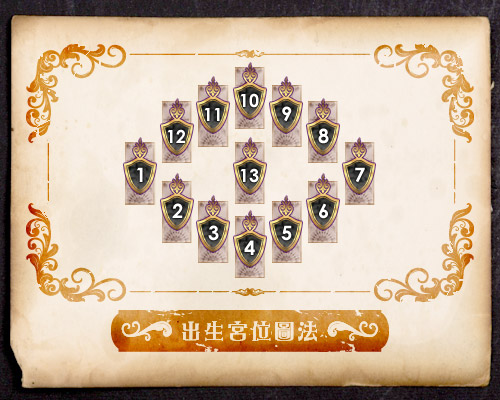 出生宮位圖法可用於解讀一個人在某一段時間內各方面的運勢。如果你沒有什麼特定的問題,想預知較長時間內的運勢,此陣法最為合適。