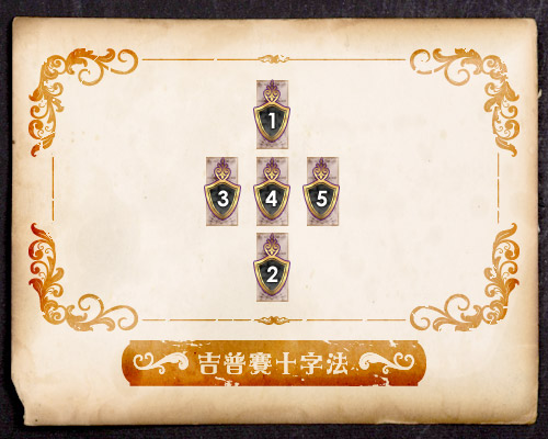 4、依圖示中的位置,將(1)到(5)張牌依序翻開,開始解讀。