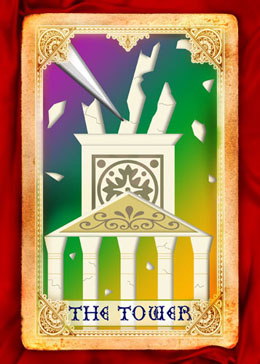 原本巍然矗立的高塔,卻被一道突來的閃電擊中而崩潰燃燒起來,這雷鳴閃電,便示意著神的憤怒與神的制裁。「高塔」代表著毀滅,全然的結束,閃電代表著突如其來的意外災難。或許和「死神」的意義相結合,「高塔」是一個強制的結束,必須先有完全的破壞才能重建。「高塔」的反位代表著「毀滅的預感」、「毀滅即將來臨」。