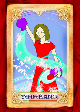 「節制」代表完全、和諧、淨化和治療。杯中的水不斷地以一種舒緩的步伐流動。這是一個療傷止痛的過程,治癒你的身心,也使事物漸漸好轉。「節制」同時代表著「緩慢」的意義,你必須以一種自制、溫和,並充滿耐心的態度面對你的問題。節制同時代表事物可能面臨一種漸漸轉化的契機。