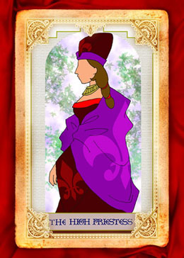 女祭司平和冷靜的表情似乎是在淺淺地微笑,眉宇間卻隱隱含著一股憂愁,她的雙眼無意識地凝視遠方,似乎正在心中沉思著某個人。身著紫衣是靈性與智慧的象徵,顯示著她的冷靜和睿智以及包容萬物的愛心與溫柔。手中的法典《TORA》象徵著她心裡藏著神秘的智慧與戒律,彷彿要樣樣與法律對照,理性地判斷事物而不會流於情緒化,由於她這種高度的精神修養,總給人一種深不可測,難以親近的感覺。女祭司手上的典籍,代表著古代流傳而來的智慧。但這代表律法的典籍,也同時壓抑了她的熱情,寬大的外袍蓋住了她的身影,同時代表著「隱匿」。她是真理的守護者,但也代表虛幻的存在,以及特有的直覺與觀察力。是堅守著純潔和法律的靈魂。